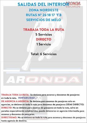 NOTA: Los datos del Manual de Servicios con los Horarios por Etapas NO coinciden, teniendo en cuenta que el Manual de Servicios corresponde a Mayo de 1983 y los Horarios por Etapas a Marzo de 1980, lo que indica modificaciones de los servicios, quizás por horarios de Invierno y horarios de Verano, o por mandato de la Dirección Nacional de Transportes, o por solicitud a la DNT por parte de O.N.D.A. S.A.. De todas formas se publican, ya que sirven para dar idea de los tiempos de viaje.